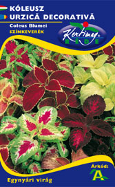 Coleus blumei Kóleusz, Mozaikvirág Napos- félárnyékos helyet kedvelő, a színes levelével diszítő növény. Jelentéktelen virágait el kell távolítani. A hajtáscsúcsokat csípjük vissza a bokrosodás elősegítésére. Vetés: február.-márciusban szaporítóládába. Kelés után tűzdeljük. Kiültetés: május második felében. Térállás: 20-30 x 20-30 cm. Felhasználás: cserepesnövényként ismert dísznövény, de kiválóan díszít növénytartókban, ablakládákban és virágágyakban. Színes levelei a kiültetéstől egészen a fagyokig változatos színhatást keltenek.