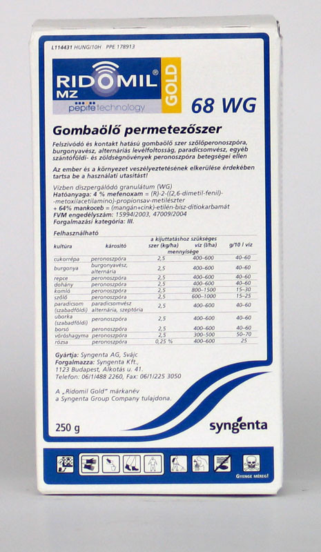 Peronoszpórafélék ellen csak tiszta, aktív hatóanyaggal. A Ridomil Gold MZ 2,5 kg/ha adagban a felszívódó és kontakt hatóanyaga révén külső és belső védelmet nyújt a növénynek a betegségek ellen. A mefenoxam a permetezés után 30 perc múlva felszívódik és a növényben csúcsirányba szállítódik. Ezáltal védelmet nyújt az új hajtások részére is. A kontakt hatású mankoceb a levél felületén marad és a gombaspórák elpusztítása révén gátolja a növény fertőződését. Hatóanyag tartalom Veszélyjel Forg. kat. M.V.I. 4% mefenoxam 64% mankoceb Vízi szervezetekre közepesen veszélyes. Méhveszélyesség: nem jelölésköteles. III. Hatásspektrum és dózis Kultúra Kártevő Dózis, kijuttatási időpont É.V.I. burgonya burgonyavész(fitoftóra) Sorzáródásig kontakt készítménnyel védekezzünk (pl. réz) ami védelmet nyújt a korai rizoktóniás, alternáriás és fitoftórás fertőzések ellen. A sorzáródást követően kezdjük a Ridomil Gold MZ-vel való permetezést 2,5 kg/ha dózisban. Két-három alkalommal, blokkszerűen juttassuk ki a Ridomil Gold MZ-t 8-12 naponként. Csapadékos időben 8 napos permetezési fordulókat tartsunk. A Ridomil Gold MZ blokk után záró permetezésre a javaslatunk az Altima, kiváló gumófitoftóra elleni hatékonysága miatt, amely a burgonya tárolhatóságát lényegesen javítja. 14 nap zöldségfélék, dísznövény peronoszpóra A fertőzés kezdetekor használjunk kétszer Ridomil Gold MZ-t, 2,5 kg/ha dózisban. Ezt kövesse két Amistar-os kezelés. uborka 7 nap dohány 28 nap vöröshagyma, borsó 21 nap komló 14 nap szója 42 nap szőlő peronoszpóra A Ridomil Gold MZ-t fertőzés-veszélyes időszakban javasoljuk kijuttatni a virágzás előtt indítva a permetezési blokkot. 21 nap paradicsom (szabadföldi) fitoftóra alternária szeptória Megelőző jelleggel javasolt alkalmazni, de legkésőbb az első tünetek megjelenésekor ki kell permetezni 2,5 kg/ha dózisban. Öntözött és járványveszélyes időjárási körülmények között 8 napos, közepes erősségű fertőzés esetén 10 napos, míg gyenge fertőzési körülmények között 12 napos permetezési forduló javasolt. 4 nap AKG program besorolás: -Agrár-környezetgazdálkodási célprogramokban használható. eltarthatóság: 3 év mvi: 0 nap; sz?l? (bor) peronoszpóra, szürkepenész (virágzáskori) 1,5-2 kg/ha, 7 nap; sz?l? (csemege) peronoszpóra, szürkepenész (virágzáskori) 1,5-2 kg/ha, 21 nap