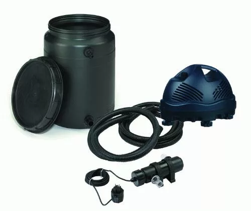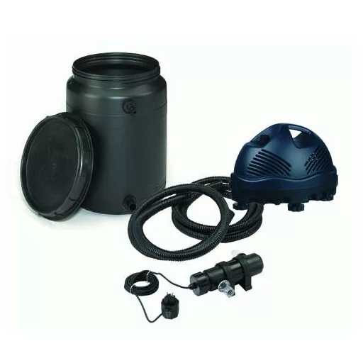 Egykamrás vízszűrő ""Bio Top 10000 plussz szett"" (szűrő + szivattyú + tömlő csatlakozó + UVC csírátlanító) tóparti Max. 10000 literes tavakig/hoz, Elimax 2500 l/óra teljesítményű vízpumpával, 4m/25mm + 2m/32mm tömlő csatlakozóval, és AlgClear UVC 10000 csírátlanítóval kapható. Ez az Elimax 2500 l/óra teljesítményű vízpumpa csak a szűrő használatakor elegendő. Ha szökőkutat és/vagy vízesést is szeretne telepíteni tavába akkor az összes vízigénynek megfelelő vízpumpát kell használnia. Ennek kiválasztásában is rendelkezésére állunk. A Bio Top „alapszett” termékcsalád: A Bio Top szűrők biológiailag, és mechanikusan is szűrik a vizet. Ez a hordó formájú egykamrás szűrő kompletten felhasználásra készen kapható (el van látva a szükséges szűrő anyagokkal, szerelési-csatlakozó tartozékokkal és használati utasításokkal). A BioTop típus nevű szűrőket a tópartra kell telepíteni! Taratalmuk: 1.) szűrőszivacs, 2.) aktiv szén, 3-5.) speciális szűrőhatású szemcsés közeg, 6.) speciális bio-derítők.