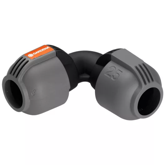 A GARDENA Sprinklersystem részét képező GARDENA 25 mm-es L-elem az vezetékcső irányának megváltoztatására szolgál. A szabadalmaztatott "Klikk és Kész" gyorscsatlakozási technológiának köszönhetően az össze- és szétszerelés egyszerűen, szerszám nélkül történik - csupán a csavaros csatlakozást kell 140°-kal elforgatni.