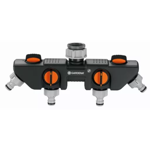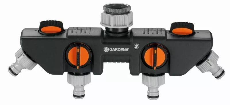 A GARDENA 4 utas elosztóval egyidejűleg több készülék is csatlakoztatható egyetlen csaphoz. A vízátfolyás valamennyi kimeneten külön szabályozható, illetve leállítható. A 4 utas elosztóhoz két GARDENA öntözőkomputer vagy öntözőóra csatlakoztatható. A 4 utas elosztó Profi rendszerű csapelem (cikkszám: 2801-20) segítségével átszerelhető GARDENA Profi rendszerre. 33,3 mm (G 1") méretű menettel és 26,5 mm (G 3/4") méretű menettel rendelkező vízcsapokkal használható.