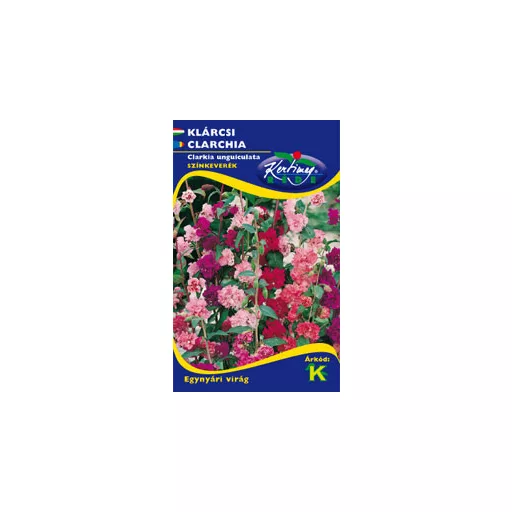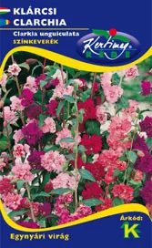 Clarkia elegans Klárcsi színkeverék Lazán elágazó, 50-60 cm-es növény. A féltelt, telt virág 4-5 cm-es, kellemes pasztell-színekben diszít. Vetés: márciusban melegágyba, április végétől állandó helyére vetjük. Június-júliusban két-három héten át igen gazdagon virágzik. Felhasználás: napos helyen kiváló virágágyi növény. Vágott virágként is mutatós.