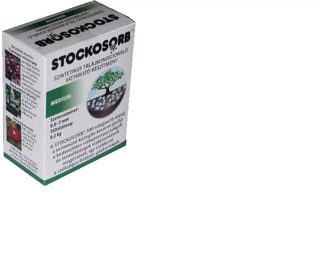 A STOCKOSORB Hydrogél granulátum legfontosabb tulajdonsága, hogy a vizet és a vízben feloldott növényi tápanyagokat elraktározza, és az elraktározott vizet, szárazság esetén ismét egyenletesen teljes mértékben leadja a talajba, illetve a növény gyökérzete részére A STOCKOSORB kiemelkedő tulajdonságai: -1 kg képes 250 liter desztillált vizet elraktározni; -a talajban 1 kg körülbelül 100-150 liter vizet abszorbál; -talajterhelés ellenére is maximális abszorpciós teljesítmény; -megnöveli a talaj pórus mennyiségét, csökkenti az erodálását; -pH semleges, tartós hatású; -hosszabb idő elteltével kezd a növény a hervadni; -segít a költségmegtakarításban. Alkalmazásának módozatai: -a száraz STOCKOSORB 500 medium szétszórható kézzel, műtrágyaszóróval vagy permetezővel, még a vetés előtt, illetve ültetés előtt, majd a talajt 15 cm mélységben fel kell szántani; -a száraz granulátum a műtrágyával együtt a vetési (ültetési) barázdába helyezhető; -előnedvesítő gélként: 1 kg STOCKOSORB 500 micro-t 200l vízzel feloldunk, ezt 30 percig duzzadni hagyjuk. A zselés oldatot a hagyományos ültetési módnál a gödörbe juttatjuk; -a STOCKOSORB a már meglévő növényi kultúra mellé utólag is a talajba juttatható egy speciális készülékkel. Alkalmazásával az alábbi problémák megoldhatók: -véletlenszerű kiszáradás megakadályozása; -pázsitnál a kisülés megakadályozása; -vízháztartás javítása, a tápanyag kimosódás megakadályozása; -telepítési vagy átültetési sokk csökkentése ill. megakadályozása; -megeredési % növelése; -humusz, tőzeg, komposzt, virágföld, kiskertek, illetve gyengébb minőségű földterületek szerkezetének javítása. Az alábbi területeken kitűnő eredménnyel alkalmazható: -konténeres csemetenevelés, erdőtelepítés; -konténeres gyümölcs- és díszfatelepítés; -intenzív dísznövénytermesztés; -pázsittelepítés; kaspók és nehezen /ápolható/ öntözhető dísznövények kiszáradásának megakadályozása.