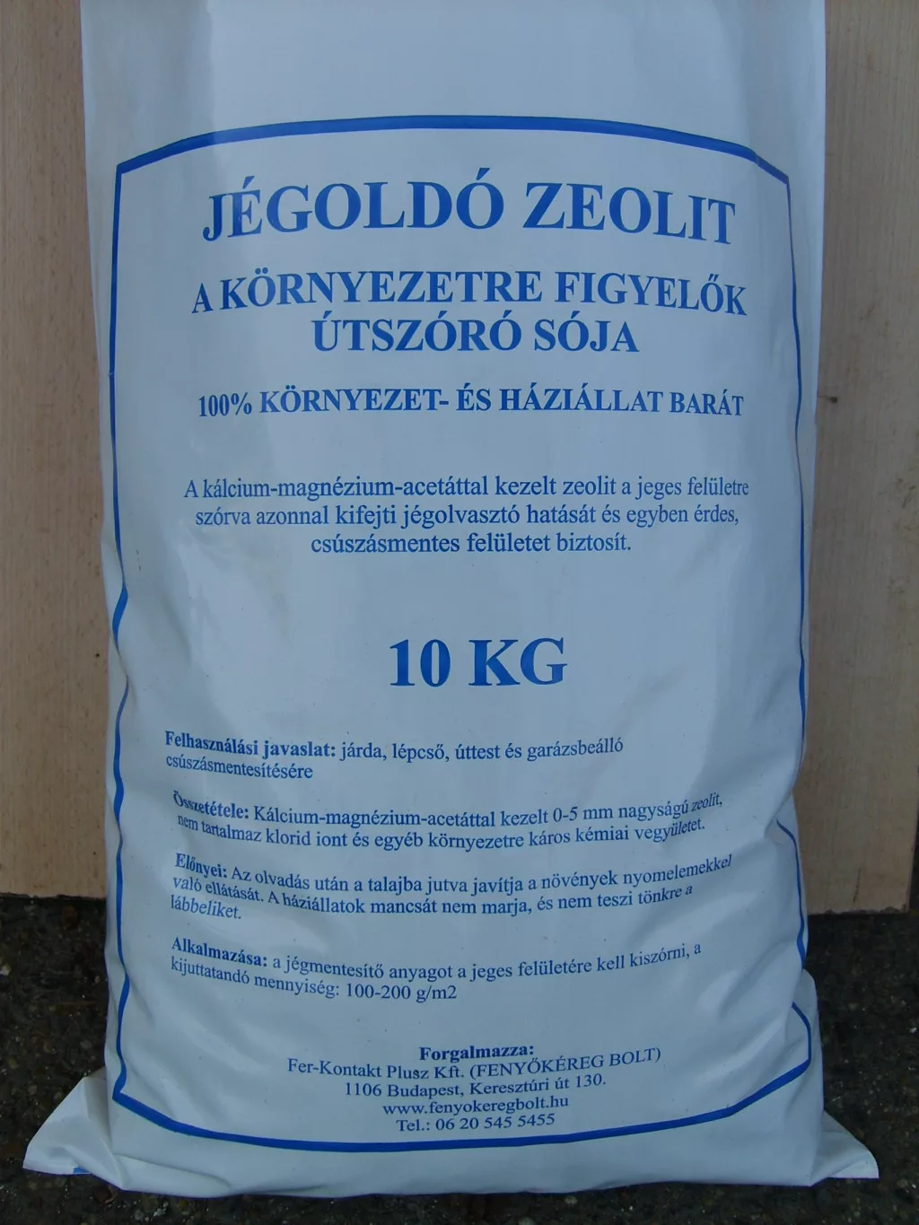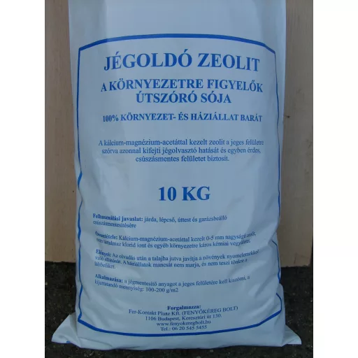 A kálcium-magnézium-acetáttal (CMA) kezelt jégoldó zeolit, 0-5mm nagyságú, nem tartalmaz kloridiont és egyéb környezetre káros kémiai vegyületet. A jeget -15 C-ig képes megolvasztani. Környezet- és háziállatbarát. Nyugat-Európában (pl. Ausztria, skandináv országok) több mint két évtizede kácium-magnézium-acetáttal kezelt zeolitot használnak az úttestek jégoldására is. A tapasztalatok azt mutatják, hogy ez nemcsak a kiváló jégoldó hatás miatt előnyös, hanem azért is, mert megköti a szálló por egy részét; különösen a járművek által felvert gumikopásból és fékbetétekből származó részecskéket. Így a levegő szennyezettsége is jelentősen csökken. A klorid tartalmú anyagok korróziót okoznak és a növényzetet is pusztítják. Nagyon lassan bomlanak le, ami szintén növeli károsító hatásukat. Emiatt fontos, hogy az útszóró sót (nátrium-klorid) olyan jégoldó hatású anyaggal váltsuk fel, amely nem tartalmaz kloridiont. Kiváló alternatív anyagok lehetnek az acetátok, amelyek teljesen veszélytelenek és 100%-ban környezetbarát ásványi anyagok. Az egészségügyben és az élelmiszeriparban is használják. A kálcium-acetát (E263) (más néven kalcium-etanoát) az ecetsav (E 260) kalciummal alkotott sója. Az élelmiszeriparban elsősorban pékáruk tartósítására, illetve a savanyúság szabályozására, az egészségügyben pedig a vér magas foszfáttartalma esetén szokták alkalmazni. Szinte minden, erjesztés útján készült élelmiszerben természetes úton megtalálható. A magnézium-acetát az ecetsav magnéziummal alkotott sója. A jégoldó zeolit használható járdák, lépcsők, úttestek, garázsbeállók és parkolók jégmentesítésére. A javasolt kijuttatandó mennyiség 100-200 g/m2, amely a jeges vagy havas felületre szórva azonnal kifejti jégolvasztó hatását, miközben érdes, csúszásmentes felületet biztosít. Hóeséskor a leeső havat részben vízzé alakítja, így megspórolhatjuk a hóeltakarításra fordított időt és energiát.
