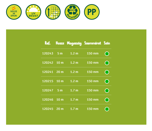 - Kordonos termesztéshez alkalmazott háló, főként uborka, bab és borsó, függőleges vagy sátortetőszerű felfuttatáshoz ajánlott.