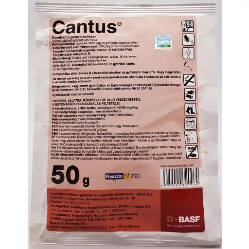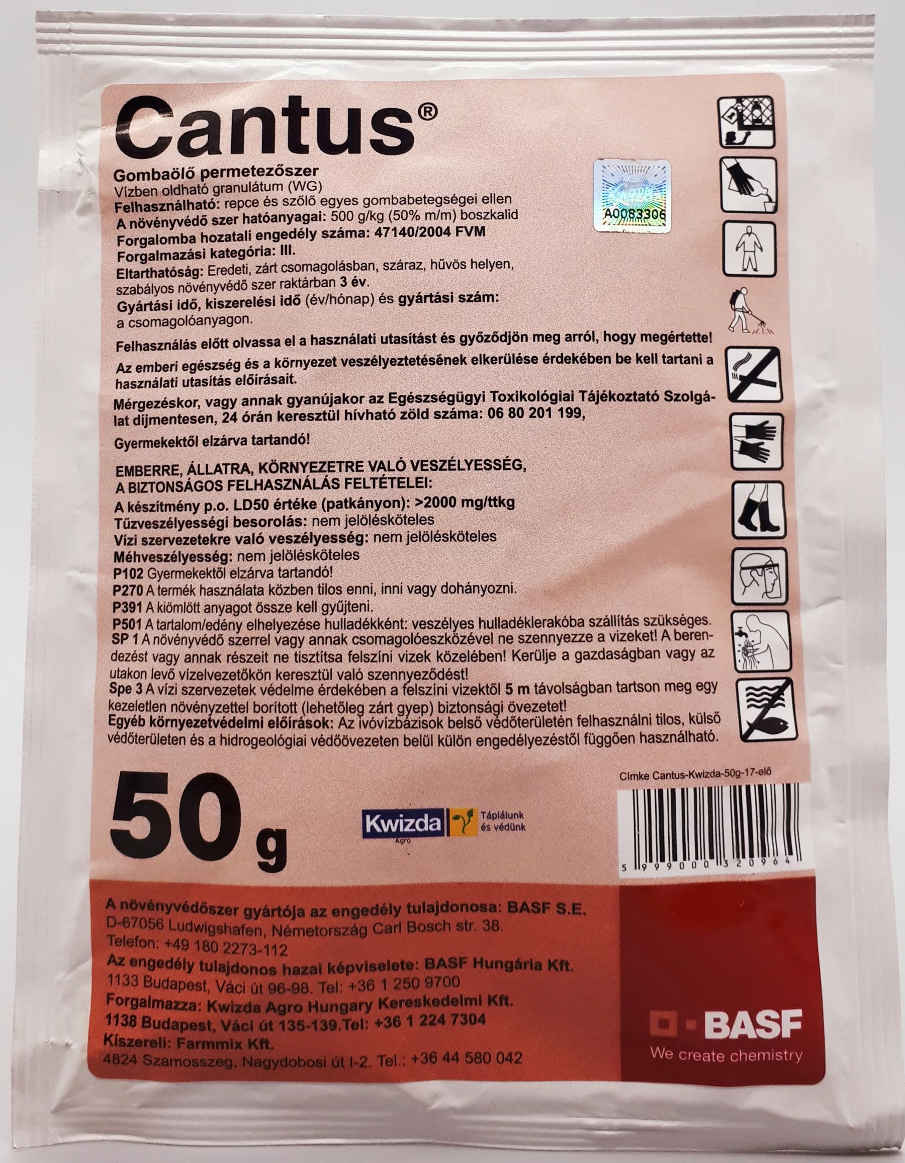 A Cantus szisztemikus és transzlamináris hatású. Rothadást okozó gombák, lisztharmatfélék, rozsdák és számos foltbetegség ellen hatékony. A gombák mitokondriális elektrontranszportját gátolja (II-komplex, TCA-ciklus). Ideális hőmérséklet és ideális időszak nem meghatározható. Hatásnövelő körülmény nincs. Kijuttatás preventíven, a fertőzési folyamat kezdetén. Permetlé vízmennyisége szántóföldön 300–500 l/ha, szőlőben 600–1000 l/ha, finomcseppes kijuttatással. Szőlőben a gombaölő szerek közül Cabrio Toppal, Vivandóval, Clarinettel,Polyram DF-fel, Delan 700 WG-vel, rézkészítményekkel, Acrobat MZ-vel vagy Forum R-rel kombinálható.