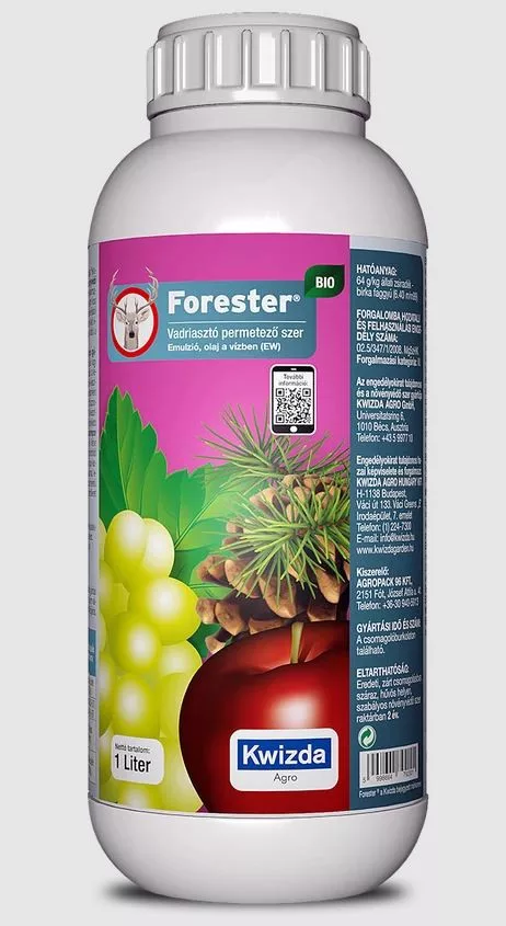 HATÁSMECHANIZMUS A Forester® EW vadriasztó permetezőszer az őz, gímszarvas és muflon rágása elleni védekezésre alkalmazható készítmény erdészeti- és gyümölcs kultúrákban. Az állati eredetű zsiradék hatóanyagot a természetben történt megfigyelések alapján fejlesztették ki, melynek használatával megvédhetőek a különböző erdészeti- és gyümölcs kultúrák a nagyvadak rágásától. A készítmény az állatok számára kellemetlen szagával váltja ki a riasztó hatást. A védendő terület kezelése után a hatástartam biztosítása érdekében a permetlének be kell száradnia, ezért száraz időben végezzük el a kezelést. Ködös, esős időben nem szabad a kezelést elvégezni, mivel a növényt védő, megszáradt permetréteg kialakulására ilyenkor nincs esély.