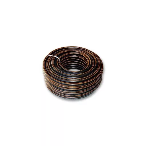 3 rétegű, szövetbetétes tömlő. I réteg: fekete PVC, UV-és algaellenálló II réteg rácsos fonat szintetikus szálakból III réteg fekete színű lágy PVC, két naracssárga vonallal Csavarodásmentes.