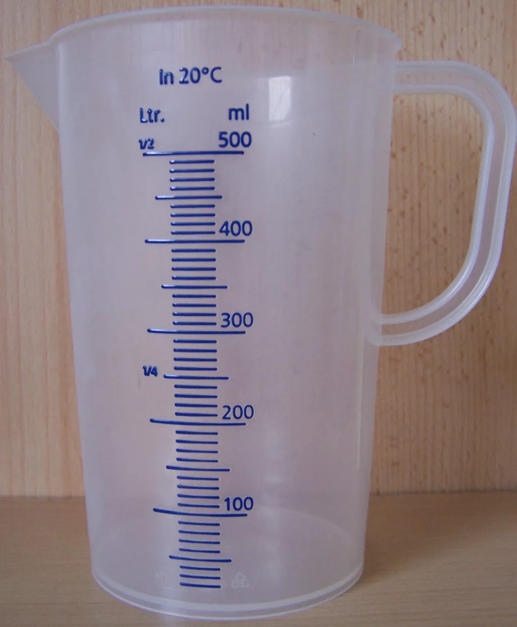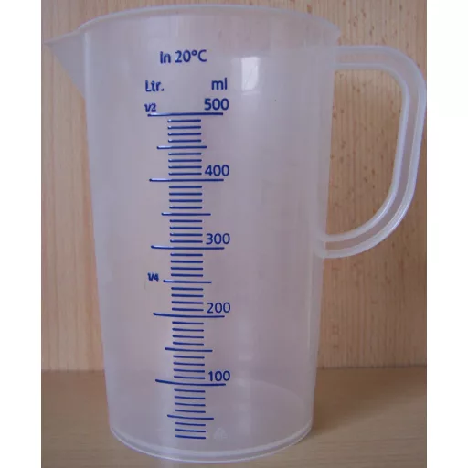 500 ml-es, füllel és kiöntő csőrrel ellátott, jól látható, kéken festett beosztással készült mérőkancsó. Jó minőségű, átlátszó műanyagból, Németországban gyártva. A polipropilén kedvező mechanikai tulajdonságai és a viszonylag jó vegyszer és hőállósága (autoklávozható és mélyfagyasztható) miatt, igen sok eszköz készül ebből az anyagból. Merevebb, mint a polietilén, áttetsző.