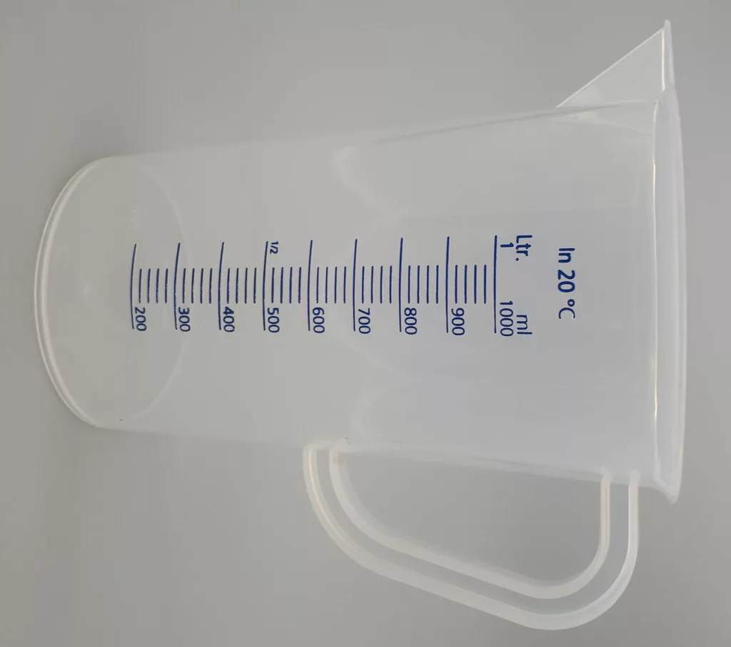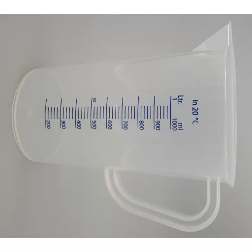 1 literes, füllel és kiöntő csőrrel ellátott, jól látható, kéken festett beosztással készült mérőkancsó. Jó minőségű, átlátszó műanyagból, Németországban gyártva. A polipropilén kedvező mechanikai tulajdonságai és a viszonylag jó vegyszer és hőállósága (autoklávozható és mélyfagyasztható) miatt, igen sok eszköz készül ebből az anyagból. Merevebb, mint a polietilén, áttetsző.