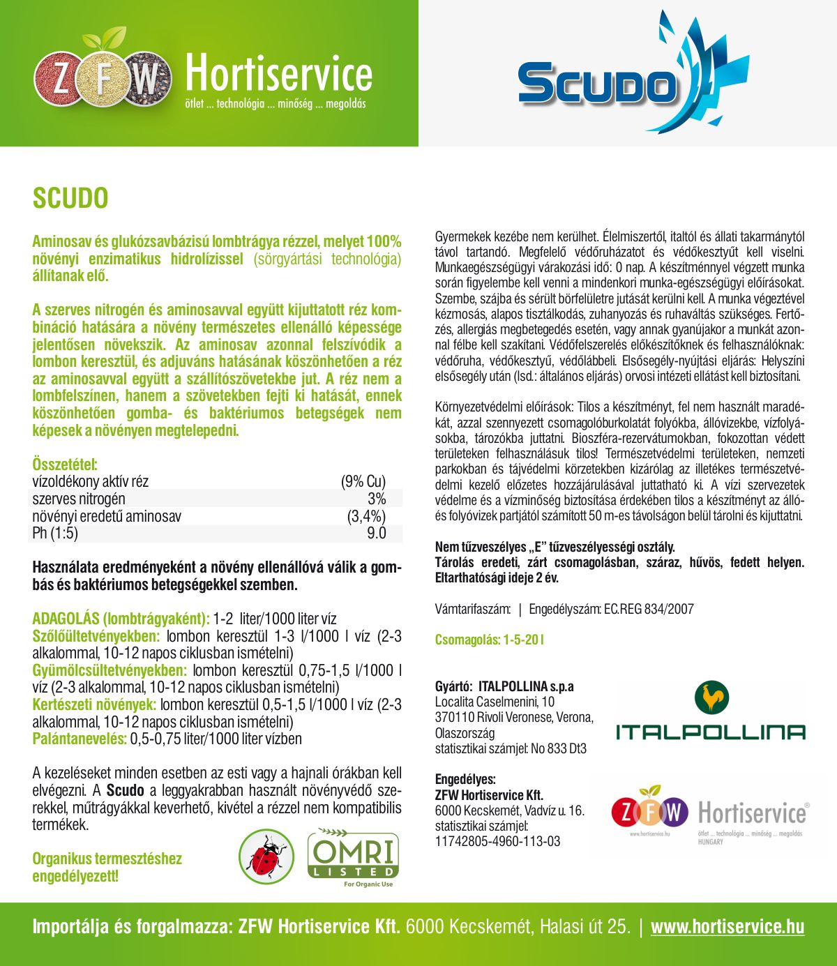 A SCUDO különleges, aminosav- és glükózsavbázisú lombtrágya aktívréz- (9% Cu) és aminosav- (3,4%) tartalommal. A SCUDO-t 100% növényi enzimatikus hidrolízissel (sörgyártási technológia) állítják elő. A szerves nitrogén és aminosavval együtt kijuttatott rézkombináció hatására a növény természetes ellenálló képessége jelentosen növekszik. Az aminosav azonnal felszívódik a lombon keresztül, és vele együtt a réz a szállítószövetekbe jut. A réz nem a lombfelszínen, hanem a szövetekben fejti ki hatását, ennek köszönhetoen gomba- és baktériumos betegségek nem képesek a növényen megtelepedni.