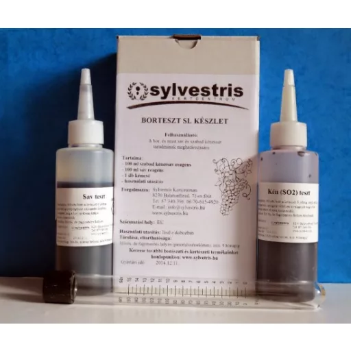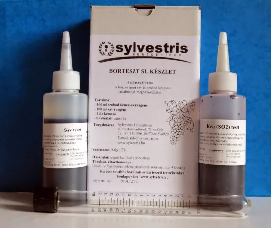 A készletet csak egyszer kell megvenni, később elég a reagenseket. . A készlet tartalmazza a kémcsövet és mindkét reagenst (savra és kénre /SO2-re), a cseppentőt és a használati utasítást! A cseppentő segít a bor szintjének beállításában.