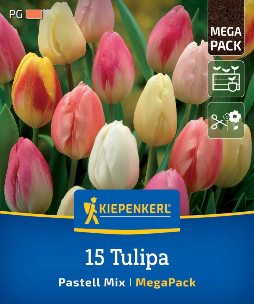 A Kiepenkerl Tulipán Pastell Mix Megapack, 15 db válogatott, lágy pasztellszínű tulipánok hagymáit tartalmazza, amelyekkel elegáns, harmonikus tavaszi virágágyást alakíthat ki. A válogatás finom rózsaszín, krémszín, halvány sárga és más világos tónusok kombinációjából áll, így természetes, mégis látványos összhatást nyújt.