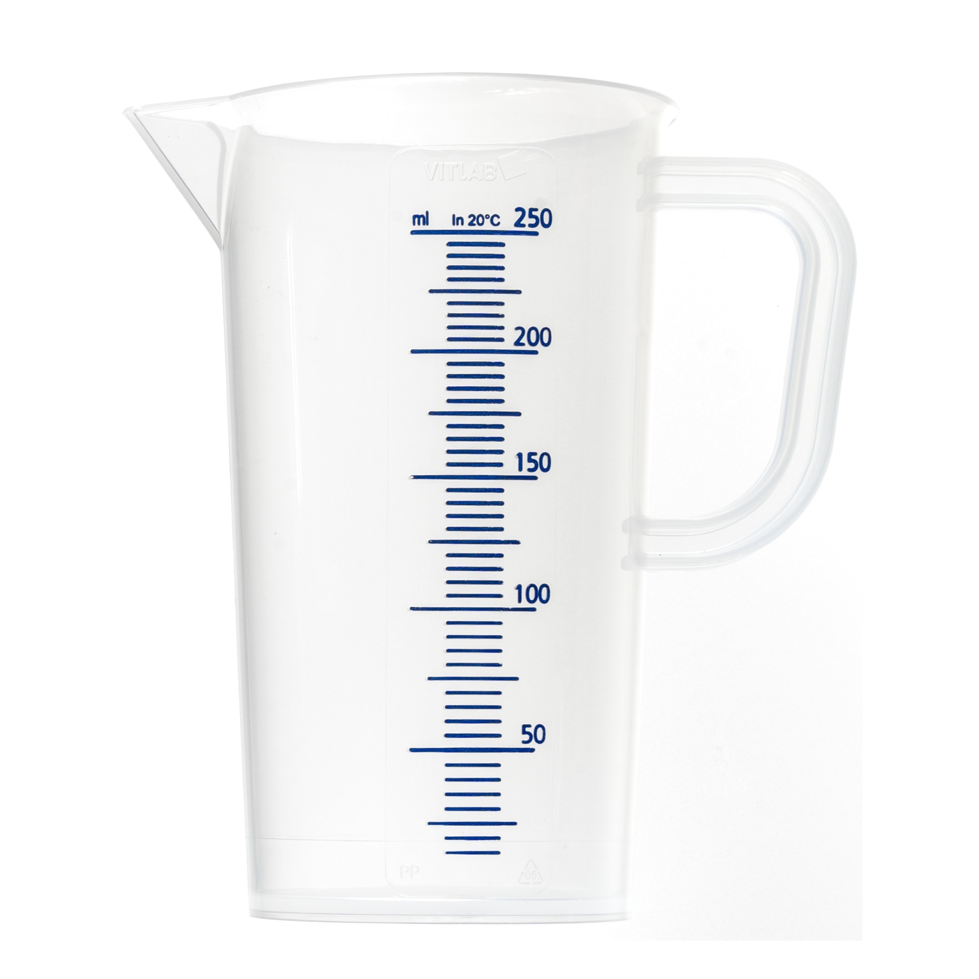 250 ml-es, füllel és kiöntő csőrrel ellátott, jól látható, kéken festett beosztással készült mérőkancsó. Jó minőségű, átlátszó műanyagból, Németországban gyártva. A polipropilén kedvező mechanikai tulajdonságai és a viszonylag jó vegyszer és hőállósága (autoklávozható és mélyfagyasztható) miatt, igen sok eszköz készül ebből az anyagból. Merevebb, mint a polietilén, áttetsző.