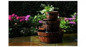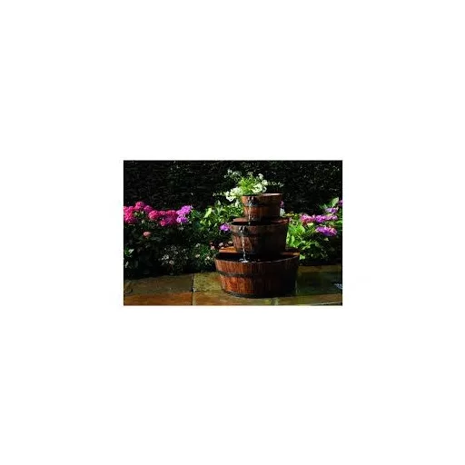 Rusztikus szökőkút, amely három fahordóból áll. Mindegyikben egy műanyag belső medence, Szivattyúval és szerelvényekkel. - Anyaga: fa - Átm: 32/46/59 cm - Magasság: 72 cm - Világítás nélkül