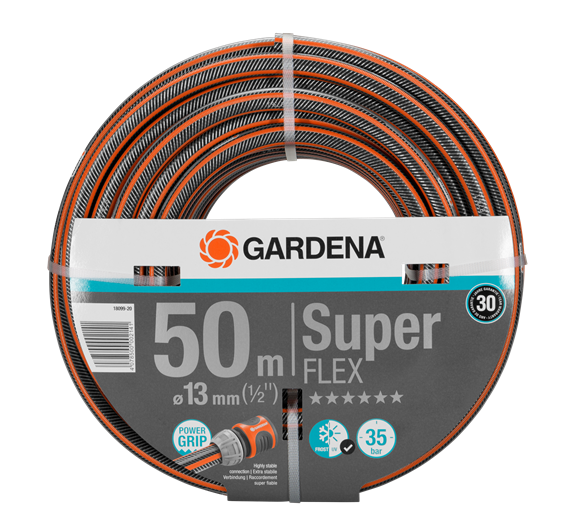 A GARDENA Premium SuperFLEX tömlő Power Grip bordázattal tökéletes csatlakozást biztosít a tömlő és a tömlőelem között. Az új technológiának köszönhetően egymásba illenek, mint a fogaskerekek. A Power Grip bordázat lehetővé teszi sok kerttulajdonos régi álmát; a megbízható kapcsolatot, tökéletes tartóerővel. A bordázott felület pozitív mellékhatása, hogy a tömlőt könnyebb feltekerni és jól csúszik. A sűrű, kiváló minőségű spirálhálós szövetnek köszönhetően, melyben két spirálszál egymással ellentétes irányban fut, a tömlő kiemelkedően nyomásálló és alaktartó, egyúttal a GARDENA legrugalmasabb tömlője. Ez a spirálok sűrűségének köszönhető, ami a tömlőt még rugalmasabbá és könnyebben kezelhetővé teszi. A tömlő nem csomózódik vagy csavarodik. Mindezek a legjobb előfeltételeket nyújtják az egyszerű és sokoldalú felhasználáshoz a kertben. Szükség esetén az Original GARDENA System csatlakozóelemeihez és öntöző eszközeihez kitűnően használható. Nem tartalmaz káros lágyítókat (ftalátokat) és nehézfémeket és természetesen UV ellenálló. A szennyeződésnek ellenálló, átlátszó külső tömlőbevonat védi. Vastag fala különösen biztonságossá, robusztussá és tartóssá teszi. 35 bar repesztő nyomás. 30 év szavatosság.