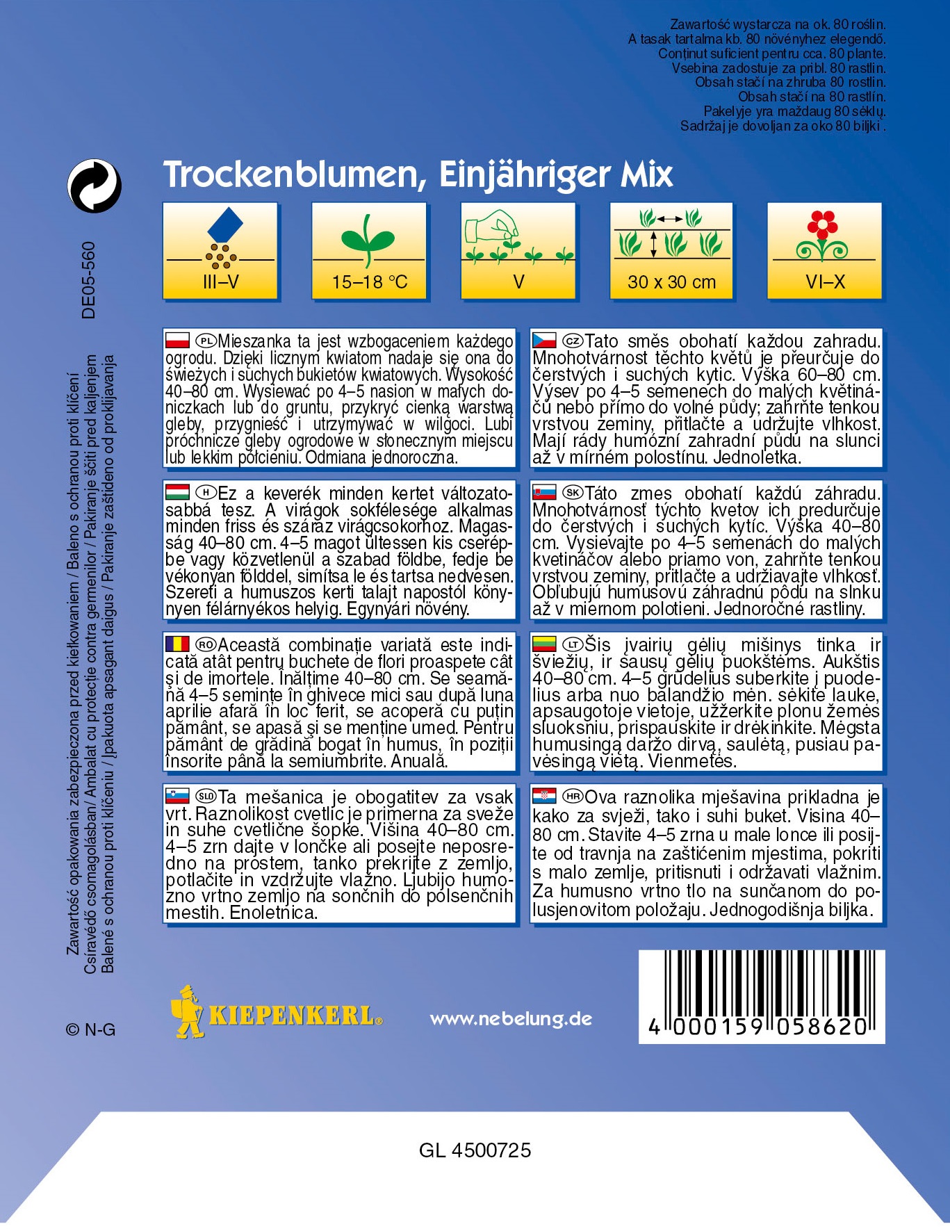 Ez a keverék minden kertet változatosabbá tesz. A virágok sokfélesége alkalmas minden friss és száraz virágcsokorhoz. Magasság 40-80 cm. 4-5 magot ültessen kis cserépbe vagy közvetlenül szabadföldbe, fedje be vékonyan földdel, simítsa le és tartsa nedvesen. Szereti a humuszos kerti talajt, napostól a félárnyékos helyig. Egynyári növény.