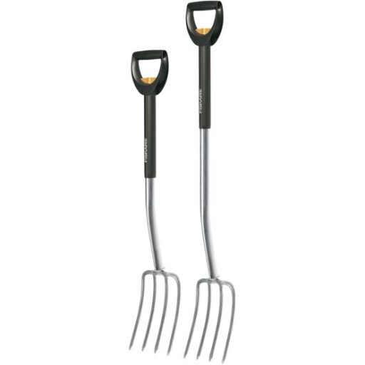 A Fiskars teleszkópos szerszámait a család minden tagja használhatja. A nyél hossza könnyen beállítható a használó testmagasságához, így mindenki a legmegfelelőbb testtartásban dolgozhat. A szerszámok könnyűek, ezért a kevésbé erős testalkatúak is használhatják őket. Az ásó és a villa fejek tartós bóracélból készülnek. A kengyel formájú markolat segíti a munkát. Szürke kivitel a teleszkópos szerszámoknál.