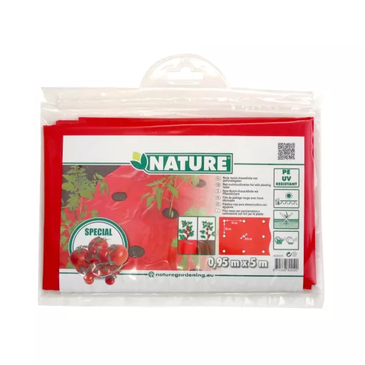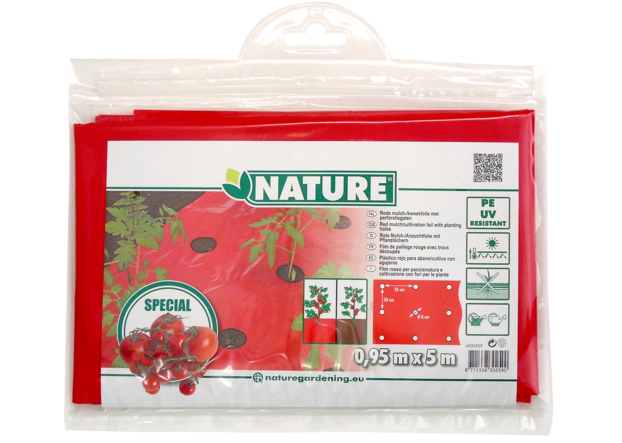 Piros színű színű, holand gyártású paradicsomfólia. Polietilénből (LDPE) készült, mikroperforált talajtakaró fólia. Ellenáll a Uv-sugárzásnak. A film szabályozza a talaj hőmérsékletét valamint megőrzi a nedvességet. Jól alkalmazható alacsony növénykultúrához. A termést védi a szennyeződéstől és megakadályozza a talajban található gombák fertőzését. A piros szín visszaverődés bizonyítottan megkétszerezi és pirosabbá teszi a termést, tisztán tartja a gyümölcsöt és átereszti a vizet. Kialakítása véget megvédi a növényeket és a talajt az eróziótól. Megszünteti a gyomosodást. A gyom elveszi tápforrást a terméstől. Három soron lyukasztott egymástól 30 cm tőketávolságra, 4,75 m2 területen 20 db 8 cm-es lyuk.