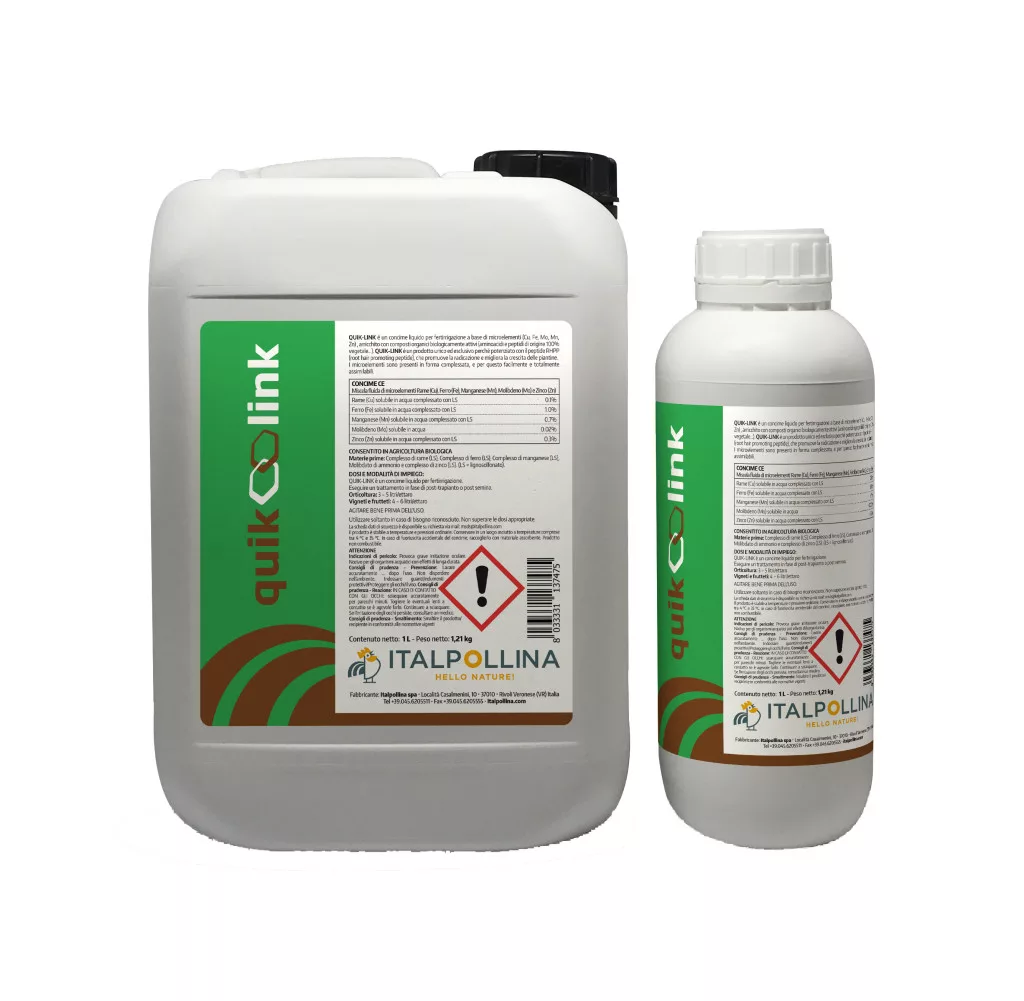 A QUIKLINK egy olyan különleges szerves tápanyag, mely gazdag aminosavakban és peptidekben, valamint hozzáadott mikroelemeket tartalmaz (réz, vas, molibdén, mangán és cink). A biológiailag aktív összetevők (nyomelemek, aminosavak és peptidek) a gyökér növekedését és a gyökérszövetek erősödését, megvastagodását (lignikfikáció) serkentik. A benne található molibdén elengedhetetlenül fontos a vegetatív növényi részek fejlődéséhez. Fokozza az anyagcserét, ezzel segít a környezeti stresszhatások és a patogének leküzdésében. Rendkívül jól működik a mikorrhiza gombákkal. Felhasználható csepegtető öntözéssel és lombtrágyaként is.