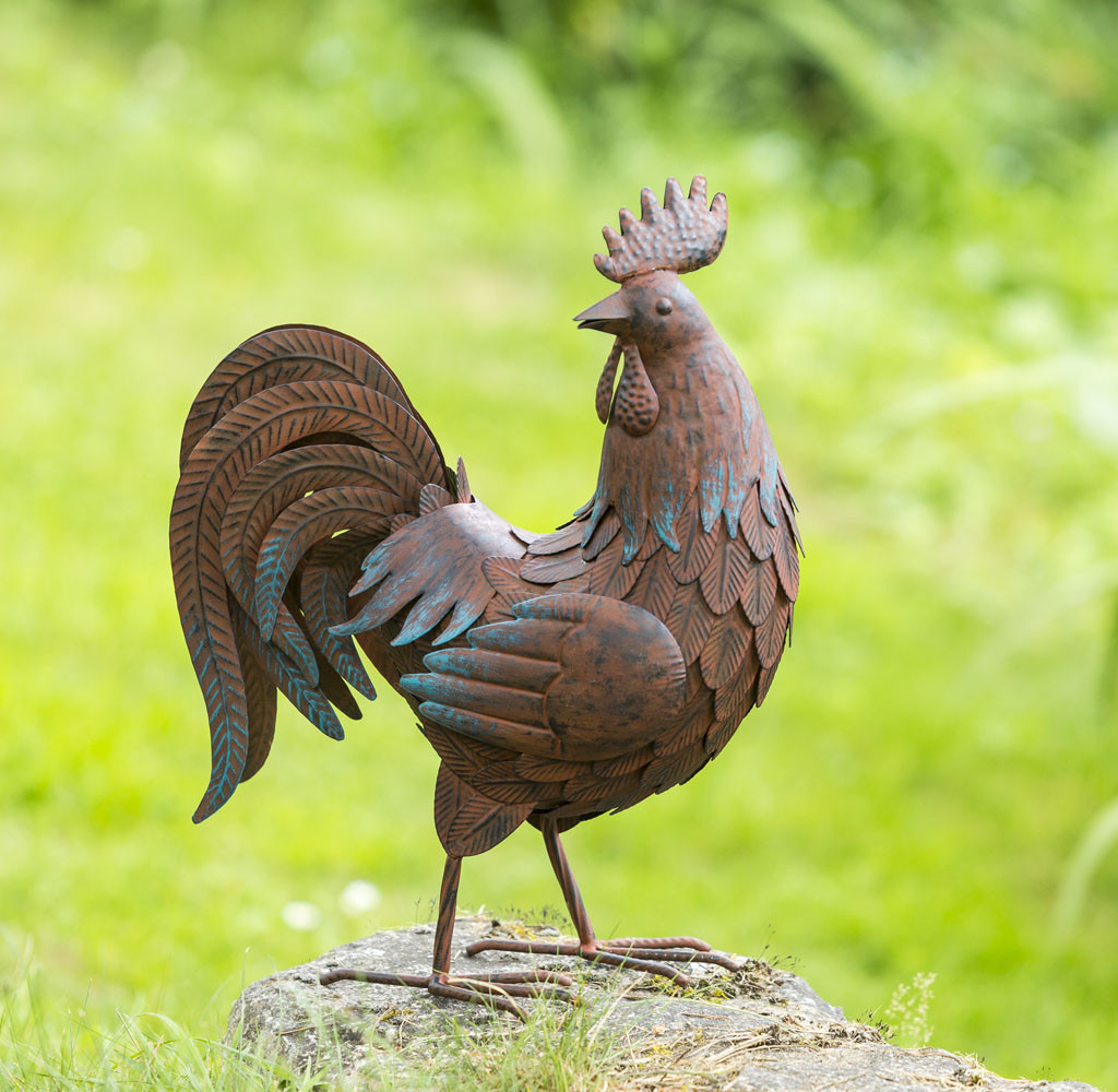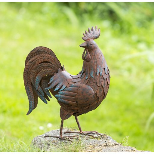Dekoratív kakas figura, mely tökéletes egy alacsony fal dekorálására is. Rozsdás hatású, fémből készült.