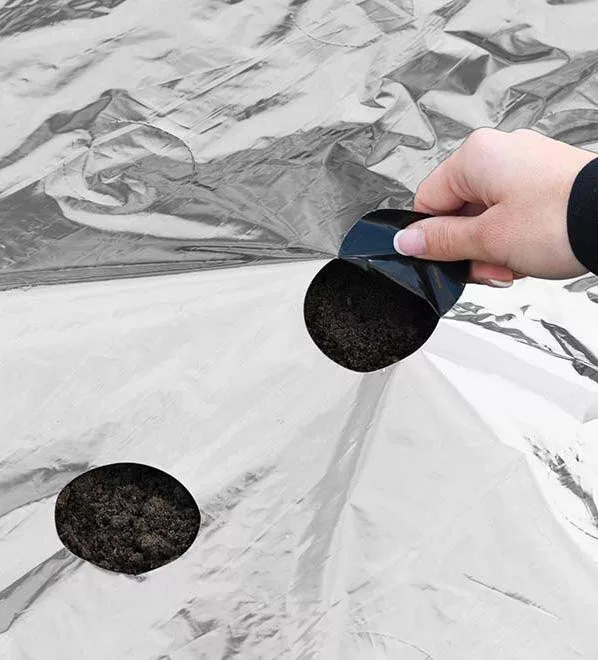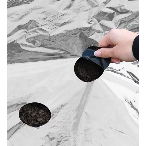 Ez a kétszínű fólia kettős hatékonyságának köszönhetően nagyobb hozamot biztosít. Egyidejűleg többféle zöldség termesztésére is alkalmas. Minden ültetési lyuk 15 cm távolságra van egymástól a sorok és a palánták között. Könnyen eltávolítható a perforációt a kiválasztott helyeken.