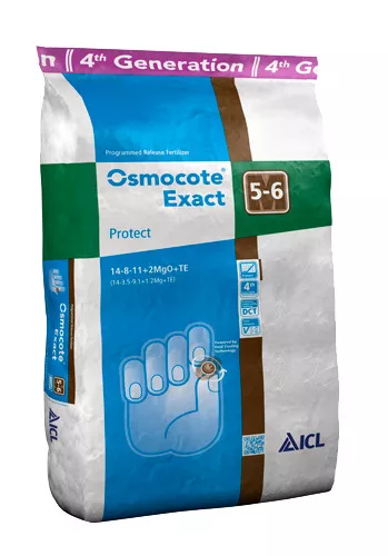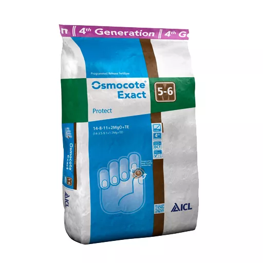 Az Osmocote Exact Protect 5-6 Hónapos késleltetett tápanyag-feltáródású műtrágya. A DCT technológiából adódó második burkolati réteg 1-2 hónappal késlelteti a tápanyagok kiáramlásának beindulását a burkolt szemcséből, így azokat megőrzi addig az ideig, amíg a növények azokat hatékonyan föl tudják venni.
