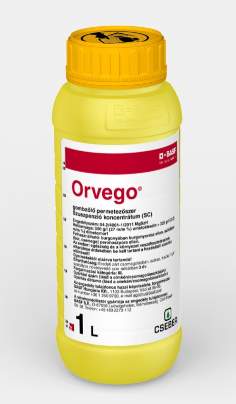 Név:ORVEGO® Formuláció:Szuszpenziókoncentrátum (SC) Hatóanyag:300 g/l ametoktradin (Initium®), 225 g/l dimetomorf Preventív, kuratív és eradikatív készítmény szőlőperonoszpóra és burgonya fitoftóra ellen A dimetomorf hatóanyagnak köszönhetően a frissen n...