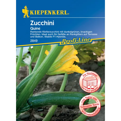 Kúszó növekedésű cukkini, termése sötétzöld, kb. 20 cm hosszú. Ideális cserépben