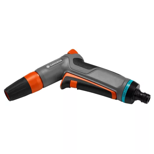 A GARDENA Comfort tisztító locsolópisztoly mind tisztításra, mind öntözésre egyaránt használható. A fejen puha műanyag elemek találhatók, amelyek védelmet nyújtanak a sérülések ellen. Folyamatos öntözéskor az impulzuskioldót tartós üzemre állíthatjuk, ami kíméli a kezet.