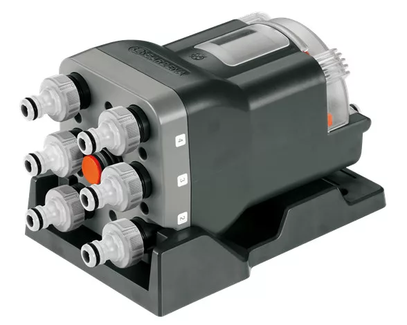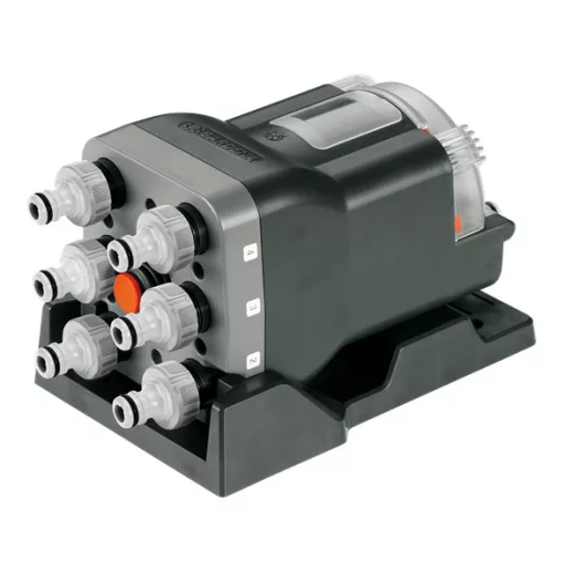 A Gardena vízelosztó automata tökéletes megoldás automata öntözéshez akár egyszerre 6 területen is. A víz mennyisége szabályozható, 26,5 mm-es (G 3/4) csatlakozómenettel rendelkezik. Egy Gardena napelemes MasterControl vagy MasterControl öntözőkomputerrel kombinálva gondoskodik akár 6 különböző terület teljesen autoamata öntözéséről, egymást követően. Például öntözheti a gyepet egy esőztetővel, a cserepes növényeket, virágágyásokat a sövényeket és a virágládákat csepegtető öntözőrendszerrel. Az öntözőkomputer a programja szerint egymást követően automatikusan kinyitja a kimeneteket. Gyakorlatilag a vízelosztó a kert igényeihez rugalmasan hozzáigazítható. Ez azt jelenti, hogy öntözhet 2 különböző területet, de akár 6-ot is. Azokat a kimeneteket, amelyeket nem szeretné használni, egyszerűen kikapcsolhatja. Mivel a különböző növények különböző vízigénnyel rendelkeznek, ezért az öntözőkomputer segítségével az öntözés időtartamát is beprogramozhatja. Így a vízelosztó a kívánt mennyiségű vizet a megfelelő helyre szállítja. Ez az intelligens megoldás ideális akkor is, ha a rendelkezésre álló vízmennyiség nem elegendő az összes öntözési eszköz egyidejű használatához. A vízelosztót egyszerűen szerelje fel a ház oldalára vagy rögzítse a földre. A rögzítőlemez segítségével ez könnyedén kivitelezhető és így bármikor el is távolítható. Mivel az összes vízkimenet egy irányba csatlakoztatható, így helytakarékos.