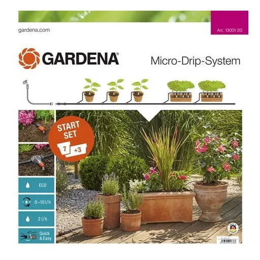 A GARDENA Micro-Drip-System Indulókészlet cserepes növényekhez M használható a teraszon vagy erkélyen elhelyezett 7 cserepes növény és 3 növényláda kényelmes és víztakarékos öntözéséhez. A nyomáscsökkentő alapelem tömlővel csatlakoztatható a vízcsaphoz. A cserepes növények a csepegtetőfejekkel pontosan és egyénileg öntözhetők. A szabadalmaztatott "Klikk és kész" csatlakoztatási technológia lehetővé teszi az elemek könnyű és gyors össze- és szétszerelését. Tartalma: 1x alapelem 1000 15 m vezetékcső 10 m elosztócső 1x T-elem 13 mm (1/2") 10x szűkítő T-elem 15x leszúrótüske 4.6 mm (3/16") 10x leszúrótüske 13 mm (1/2") 7x szabályozható végcsepegtető 9x 2 l sorcsepegtető 3x zárótömítés 4.6 mm (3/16") 2x zárótömítés 13 mm (1/2") 1x tisztítótű.