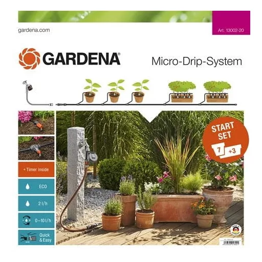 A GARDENA Micro-Drip-System Indulókészlet cserepes növényekhez M automatic erkélyeken és teraszokon található 7 cserepes növény és 3 virágláda kényelmes és víztakarékos öntözéséhez használható. A nyomáscsökkentő alapelem a vezetékcsővel csatlakoztatható a vízcsaphoz. A cserepes növények a csepegtetőfejekkel pontosan és egyénileg öntözhetők. A szabadalmaztatott "Klikk és kész" csatlakoztatási technológia lehetővé teszi az elemek könnyű és gyors össze- és szétszerelését. A rendszert automatikusan irányítja a GARDENA öntözőkomputer. Tartalma: 1x öntözőkomputer EasyControl 1x alapelem 1000 15 m vezetékcső 10 m elosztócső 1x T-elem 13 mm (1/2") 10x szűkítő T-elem 15x leszúrótüske 4.6 mm (3/16") 10x leszúrótüske 13 mm (1/2") 7x szabályozható végcsepegtető 9x 2 l sorcsepegtető 3x záródugó 4.6 mm (3/16") 2x zárótömítés 13 mm (1/2") 1x tisztítótű.