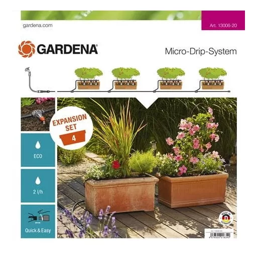 A GARDENA Micro-Drip-System Bővítő készlet cserepes növényekhez XL a Micro-Drip Indulókészlet cserepes növényekhez M és Indulókészlet cserepes növényekhez M automatic ideális bővítéséhez. Tartalmaz mindent, ami további 4 virág- vagy növényláda pontos öntözéséhez szükséges. A szabadalmaztatott "Klikk és kész" csatlakoztatási technológia lehetővé teszi a rendszer könnyű és gyors bővítését. Tartalma: 10 m elosztócső 4x szűkítő T-elem 12x 2 l sorcsepegtető 10x leszúrótüske 4.6 mm (3/16")