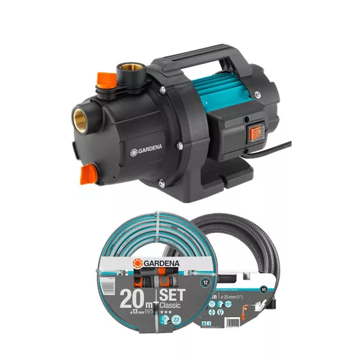 A GARDENA Kerti szivattyúkészlet mindent tartalmaz, amire az elektromos szivattyú gyors csatlakoztatásához és beindításához szükséges. A készlet tartalma egy Classic Kerti szivattyú 3000/4, egy 3,5 méter hosszú GARDENA szívótömlő és az eredeti, 20 méteres GARDENA kerti tömlő locsolófejjel és csatlakozóelemekkel.A kompakt és strapabíró GARDENA Kerti szivattyú 3000/4 modellt különféle kerti szivattyúzási feladatokra tervezték. Használhatod öntözésre, víznyomás növelésére, talajvíz, csapvíz, esővíz, sőt akár klórozott medencevíz szivattyúzására. A Kerti szivattyú 3000/4 segíti, könnyebbé és hatékonyabbá teszi a kertészkedést. Ez a könnyű, tartós és kompakt elektromos szivattyú egyszerűen használható, nagy szívóerőt biztosít nagyon magas nyomás mellett. Feltöltése és leeresztése egyszerű az extra töltőnyílásnak és a leeresztő csavarnak köszönhetően. Így a bennmaradó vizet leeresztheted és a szivattyút véded az esetleges fagykár ellen. Az ergonomikusan kialakított fogantyúnak és a kis súlyú kivitelnek köszönhetően a szivattyú szállítása is egyszerűen megoldható a kertben. Sőt, a talajra helyezve a szivattyú biztos lábakon áll és üzemel. A beépített főkapcsoló teszi lehetővé a kényelmes használatot.A kerti szivattyút használat közben a hővédő kapcsoló védi, amely leállítja a túlhevült motort. A GARDENA szivattyúk nem alkalmasak sós víz, agresszív vagy könnyen éghető anyagok és élelmiszer szivattyúzására. A Kerti szivattyú 3000/4 készlet tökéletes választás, mivel a csomag mindent tartalmaz, amire szükséged lehet. A GARDENA megbízható piacvezető 40 évnyi tapasztalattal a szivattyútervezés és -gyártás területén. Ez a szivattyúkészlet megéri az árát, ha alkalmi használatra keresel gépet.