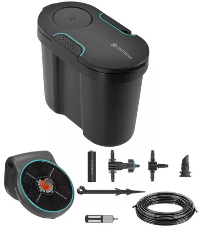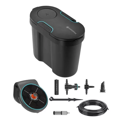 Akár nyaralni mész, akár csak elfoglalt az otthoni életed, a GARDENA AquaBloom+Víztartály készlettel akár 20 növényt is megbízhatóan és egyenletesen öntözhetsz az erkélyen vagy teraszon. A napelemes, víztartályos öntözőkészlet nem igényel áramcsatlakozást. A napelem és az újratölthető akkumulátorok kombinációja garantálja a megbízható öntözést az egész szezonban. 14 előre beállított öntözési program közül választhatsz, és meghatározhatod a növények számára optimális vízmennyiséget. Mindezt vízcsatlakozás nélkül, a beépített szivattyúnak és a csatlakoztatott víztartálynak köszönhetően. Mivel a készletben minden szükséges alkatrész, beleértve az elemeket is, megtalálható, így az automata öntözőrendszert azonnal telepítheted és használhatod. Az AquaBloom +Víztartály készlet egyesíti az optimális funkcionalitást a fenntarthatósággal. A 10,5 literes víztartályban akár 12 napra elegendő víz is elfér. A kapacitás további tartályok csatlakoztatásával bővíthető. A készlet 80 százalékban újrahasznosított anyagból készült, vagyis ez egy fenntartható öntözési lehetőség. A tartály aljára szűrőt lehet rögzíteni, így a maximális vízfelhasználás érhető el. Az üres víztartályt praktikus tárolási lehetőséged nyújt a készlet egyes elemei számára a téli/őszi szezonban. A GARDENA AquaBloom+Víztartály készlet modern és innovatív kialakítása nemcsak időtállóvá teszi az egész rendszert, hanem tökéletesen illeszkedik a modern terasz és erkély stílusához is. Távolléti növénygondozás. Független öntözés szobanövények számára.