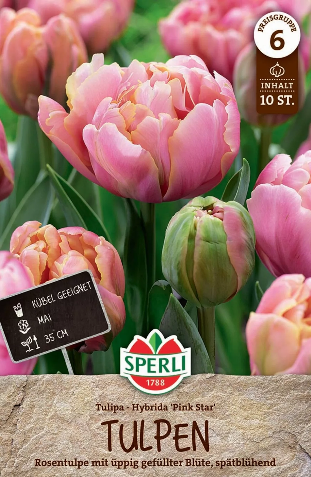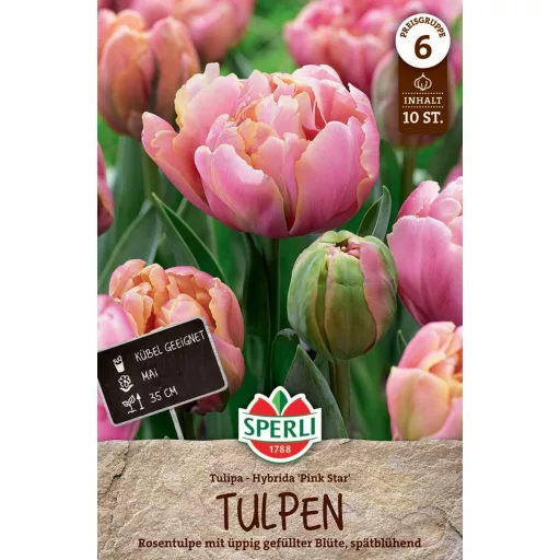 A Pink Star tulipán jellemzői: Meglepő hármszínű teltvirágú tulipán, rengeteg sziromlevéllel. A sziromlevél alapszíne rózsaszín, a csúcsi része fehérbe hajló, a szélek sárgák. A hagymákat jó szellőző, száraz helyen tároljuk. Házikerti ágyásokba és balkonl...