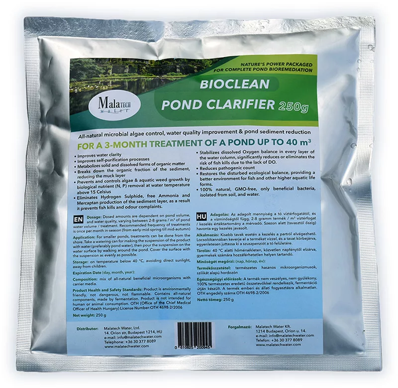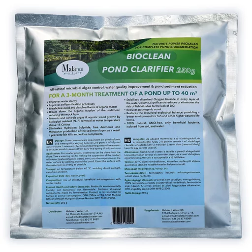 Egy darab 250 g-os tasak egy, akár 40 m3 térfogatú tó 3 havi fenntartó kezelésére elegendő!
