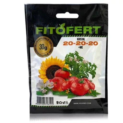 A FitoFert Kristal 20-20-20+ME jellemzői: Kiegyensúlyozott NPK összetétel, hozzáadott mikroelem tartalommal. • Serkenti a vegetatív részek növekedését. • Univerzális összetétel csepegtetőöntözéssel és lombon keresztül történő tápanyag ellátásra Összetétel...