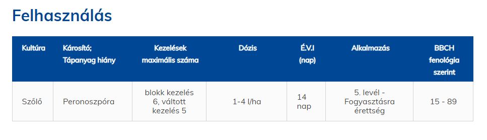 Szőlőben a kezeléseket a fertőzésveszélyes időszakban előrejelzésre alapozottan, a tünetek megjelenése előtt kell elkezdeni. A készítményt blokkosított kezelés formájában, vagy más, peronoszpóra elleni készítményekkel váltakozva lehet kijuttatni.