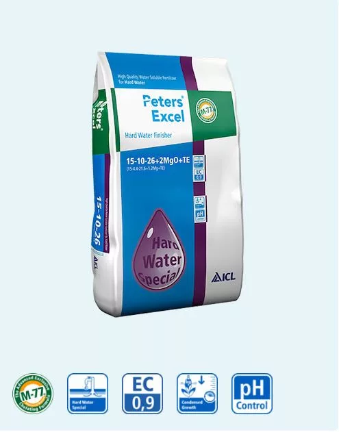 A Peters Excel 15-10-26 (Hard Water Grow Special) prémium minőségű vízoldható műtrágya, amely semlegesíti a kemény öntözővíz hidrogénkarbonát-tartalmát.