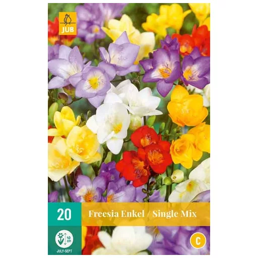A Virághagyma Frézia Enkel/Single mix 20 db JUB egy gondosan összeállított, egyszerű virágú frézia válogatás, amely változatos, élénk színekkel díszíti a kertet vagy a teraszt. Az Enkel/Single mix jelölés az egyes, nem telt virágokra utal, amelyek letisztult, elegáns megjelenést kölcsönöznek az ágyásoknak és a csokroknak.