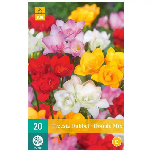 A Frézia Double mix virághagyma válogatás 20 darab, gondosan válogatott, telt virágú frézia hagymát tartalmaz a JUB minőségében. A keverék többféle, élénk és pasztell színű virágot hozhat, így változatos, látványos virágzást érhet el egyetlen csomaggal. A frézia különösen kedvelt finom illata és elegáns, kecses virágai miatt, amelyek a kertben és a vázában is jól mutatnak.