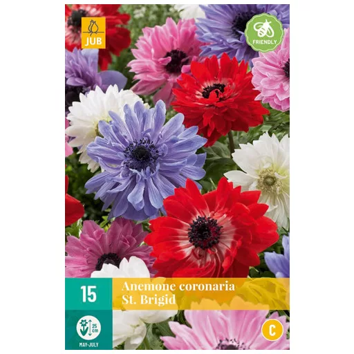Az Anemone St. Brigid (Anemone coronaria) duplavirágú virágaival lep meg feltűnő színek keverékében. Ez a szellőrózsa fajta problémamentes kerti növény, amely könnyen virágzik. Sőt, kiváló vágott virág, és gyönyörűen kombinálható más nyári hagymásokkal.