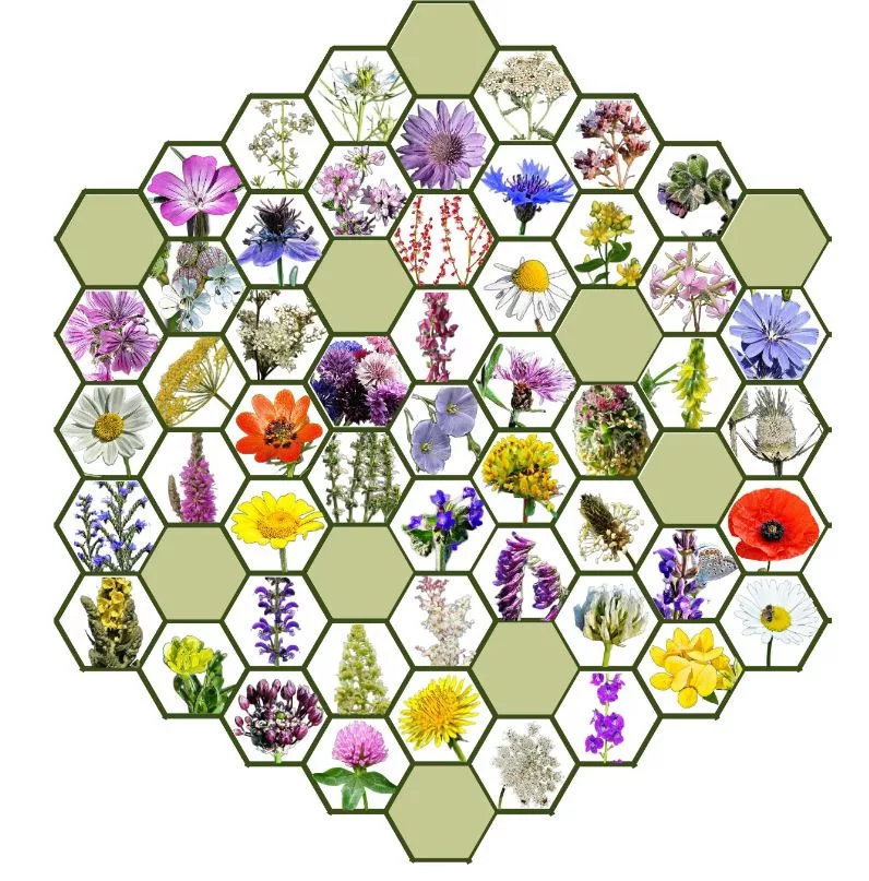 búzavirág (színkeverék és vad), csabaíre vérfű, dúsvirágú/szöszös ökörfarkkóró, ékes vasvirág mix, erdei mályva, évelő len, fehér here, fehér mécsvirág, festő pipitér, héjakút mácsonya, hólyagos habszegfű, kamilla, kapor, keleti szarkaláb, kígyóhagyma, koloncos legyezőfű, konkoly, közönséges cickafark, közönséges ebnyelvűfű, közönséges galaj, közönséges orbáncfű, lándzsás útifű, ligeti zsálya, magyar zsálya, mezei árvácska, mezei katáng, mezei katicavirág, mezei szarkaláb, mezei zsálya, nyári hérics, nyúlszapuka, orvosi atracél, orvosi somkóró, orvosi szappanfű, osztrák zsálya, parlagi pipitér, pipacs, pitypang, réti imola, réti legyezőfű, réti margitvirág, szarvaskerep, szöszös bükköny, szurokfű, tarka koronafürt, terjőke kígyószisz, vadmurok, vadrezeda, vetési/réti boglárka, vörös here