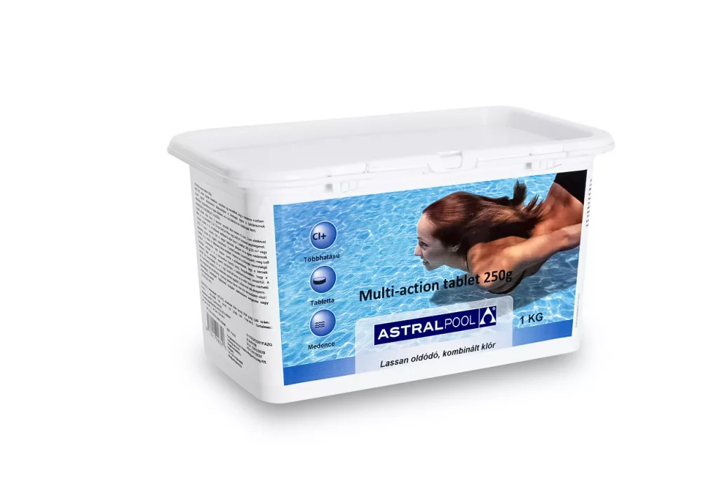 Többfunkciós 250 grammos vízkezelő tabletta stabilizált klór tartalommal. Lassú és egyenletes oldódása biztosítja a folyamatos fertőtlenítő hatást. Egyszerre tartalmaz algicid és pelyhesítő összetevőket a kristálytiszta medencevízért.