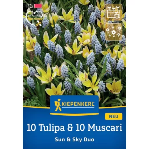 A Virághagyma Mix 10 Tulipa & 10 Muscari Sun and Sky Duo Kiepenkerl 20 db gondosan összeválogatott, őszi ültetésű virághagyma válogatás. A csomag 10 darab tulipán (Tulipa) és 10 darab gyöngyike (Muscari) hagymát tartalmaz, amelyek együtt ültetve harmonikus, mégis kontrasztos tavaszi virágzást hoznak létre.