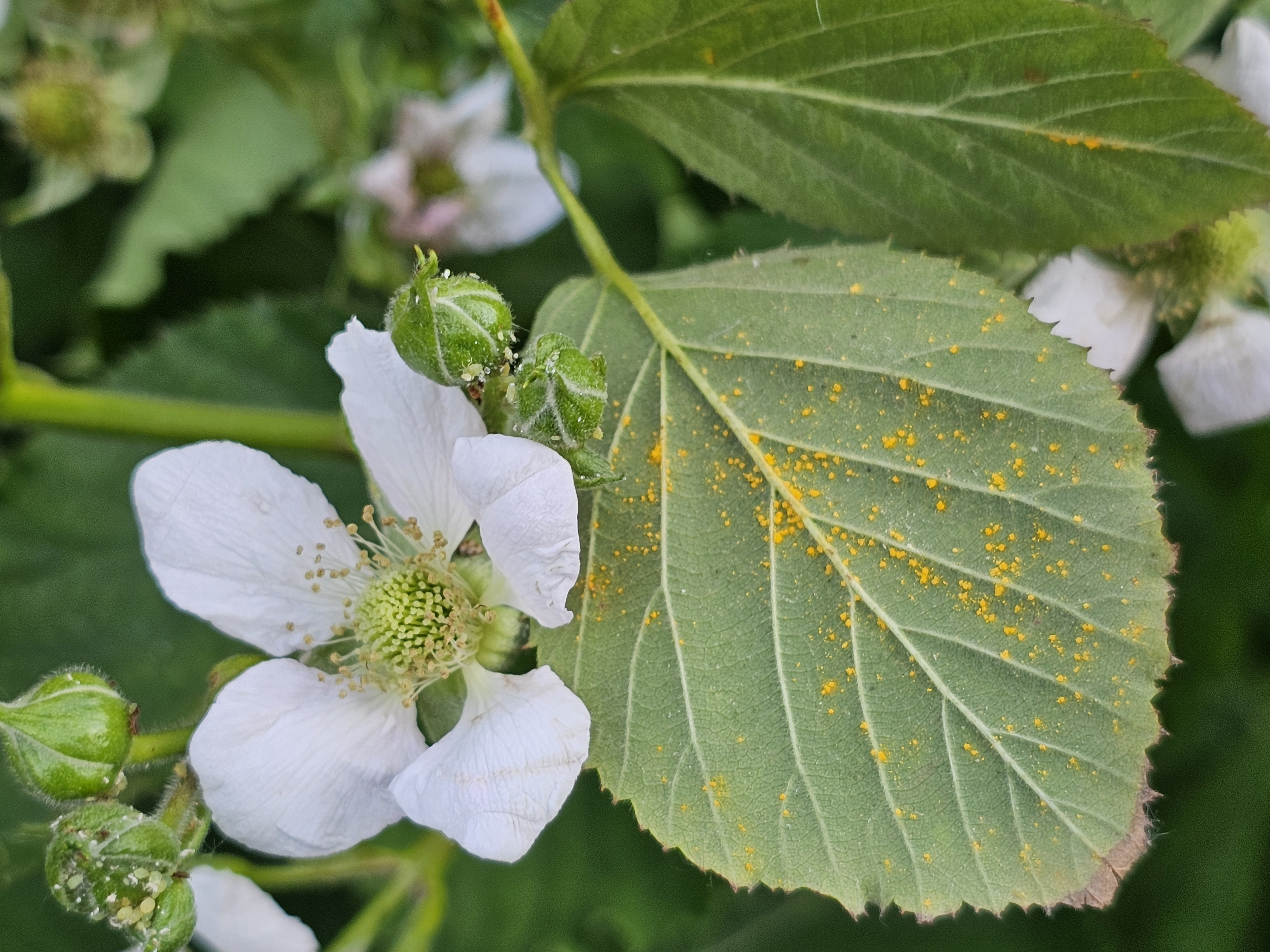 Június 5-én fotóztam a szederrozsda fiatal sárga telepeit is tüskétlen szedren, a Chorus 50 WG engedélyezett ellene. Az egyszerű anyagok között nem találtam kifejezetten a rozsdákra engedélyezett készítményeket.