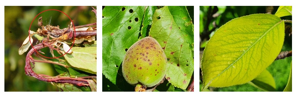 Most a levéllyukacsosodást okozó gomba (sztigmina) is jól érzi magát. A 2. fénykép a hétvégén készült. A levél színén, fonákán és már a gyümölcsön is láthatják a tüneteit. Ennél a fertőzési szintnél S.O.S. permetezést javaslok! A rézpótlónak is hívott mankoceb hatóanyag (2. felhívás, pl. Dithane) a monília telepeit is gyéríteni fogja. Enyhe fertőzésnél a kéntartalmúak is hatásosak. A felszívódók közül pl. a Topas 100 EC, a Teldor 500 SC, a Signum WG és a Switch 62,5 WG engedélyezett kajsziban moníliára és levéllyukacsosodásra is.