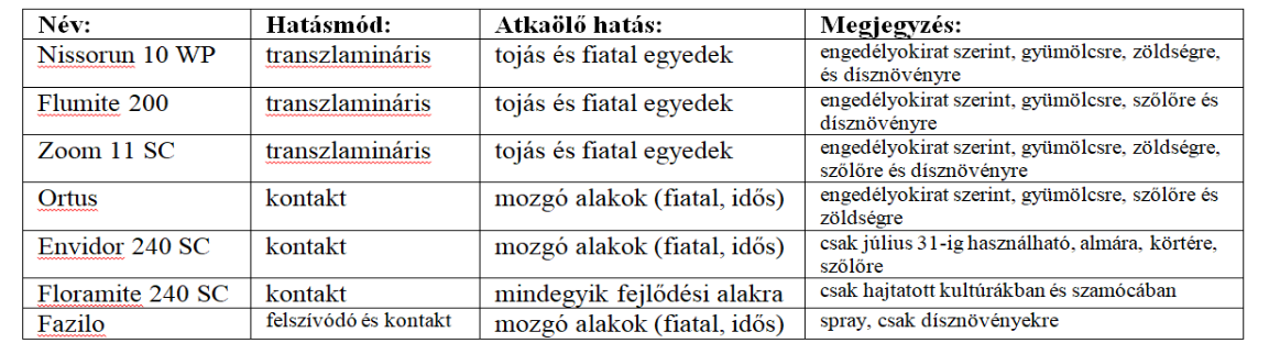 Az atkaölő szerek többsége kontakt, így kiemelt jelentősége van az apró cseppképzésnek és a bőséges lémennyiségnek. Csak így tudjuk eltalálni az apró, most még a felszínen tartózkodó gubacsatkákat, majd nyáron a takácsatkákat. További nehézséget jelent az atkák elleni harcban, hogy az atkaölők többsége nem pusztítja el az összes fejlődési alakot, ezért felváltva kell dolgozni velük. A készítmények nagy része évente csak egyszer használható, mert nagyon gyorsan kialakul a rezisztencia az atkákban. Ez a megszorítás is indokolja, hogy a gyérítő kénes gombaölőket és az atkákat kiszárító, vagy azokat bevonó és megfullasztó egyéb készítményeket is használnunk kell a siker érdekében. Ilyen pl. a Vektafid A 0,5-1%-os töménységben. Az alábbi táblázatban igyekeztem a bárki számára megvásárolható, szabadforgalmú (III. kategóriás) atkaölő készítményeket csoportosítani. A levél felszínéről, a levéllemezen keresztül a fonákra is áthatoló, ún. „transzlamináris” atkaölők még a fiatal gubacsokba is bejutnak. Ezek már nem csak kontakt módon hatnak.